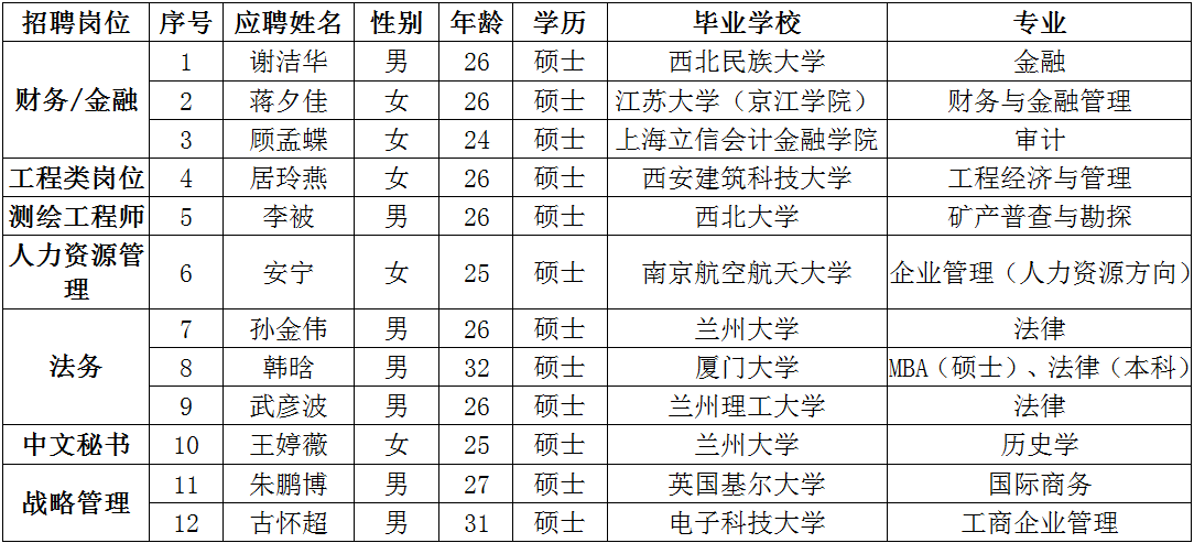 為(wèi)适應總公司的(de)發展需求,完善崗位配置,總公司本着“公平公開、公開競聘、擇優錄取”的(de)原則,進行了公開招聘選拔。總公司2017-2018年(nián)度參加了市委組織部及市人才中心組織的(de)北京、上海、蘭州、西安、南京五地(dì)共計10場招聘會,并以《淮安經濟技術開發區經濟發展總公司普通崗位招聘面試工作方案》為(wèi)依據,于2018年(nián)3月6日完成了公開招聘面試工作,經面試、背景調查、健康體檢,現對拟錄用的(de)12名工作人員予以公示,如(rú)有異議,請于2018年(nián)3月22日17:30前與總公司行政人資部聯系。具體名單如(rú)下: